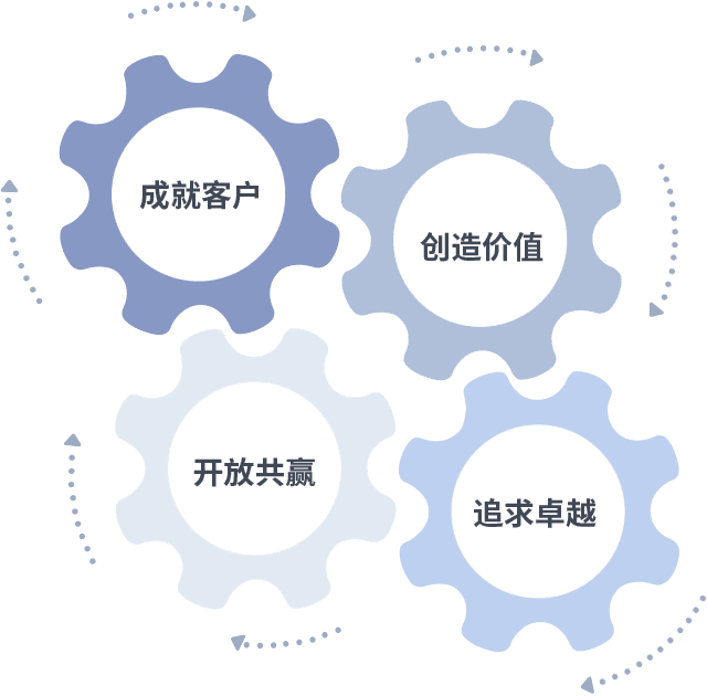 成就客户是一切决策的出发点,,,创造价值是衡量所有工作的标准,,追求卓越是我们做事做人的态度,,开放共赢是我们的格局也是最终的结果。。价值观的齿轮环环相扣,,,,推动着组织里的每个人不断向前。。