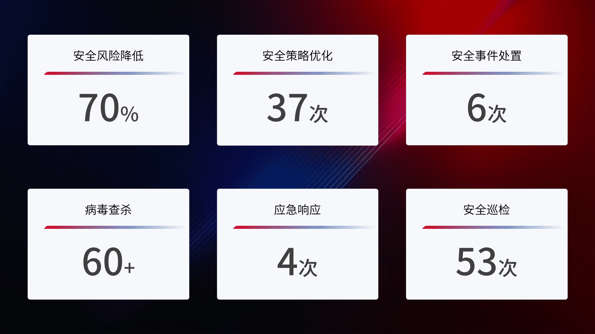提供全面的安全事件报告体系,,包括处置报告、、周报、、、季度和年度总结,,,结合持续监控,,,帮助客户深入了解网络安全状况。。。。
